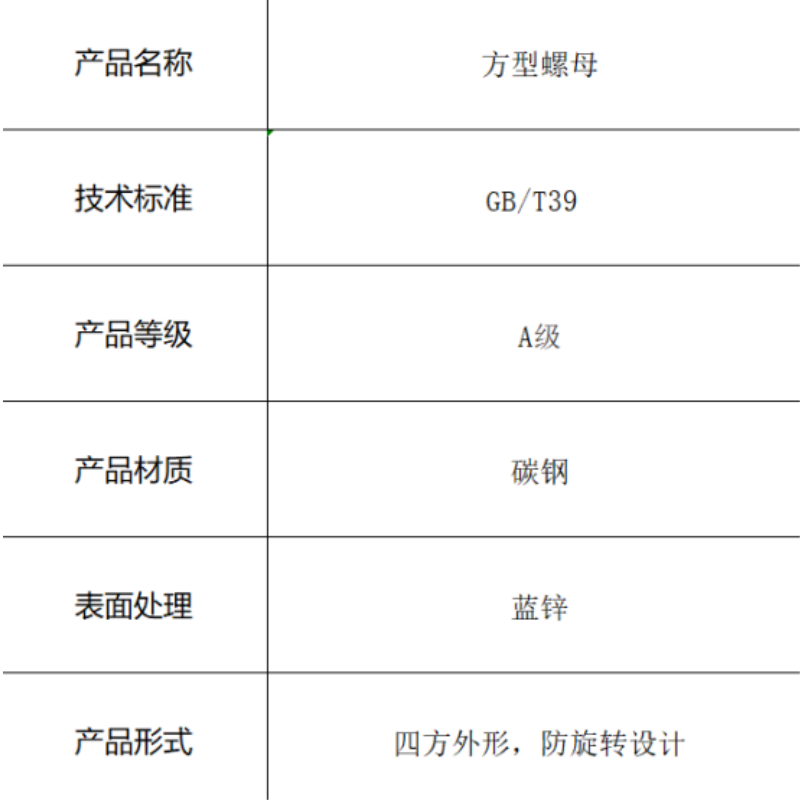 本产品为方型螺母,严格遵循GB/T39 A级标准制造。采用优质碳钢材质,性能等级达4.8级,表面经蓝锌处理,兼具防锈与美观特性。其独特的四方外形设计,便于在安装过程中使用扳手卡位,有效防止打滑,特别适合在狭窄或需要防旋转的场合使用。我们支持各种规格型号的定制服务,满足您的特定需求。