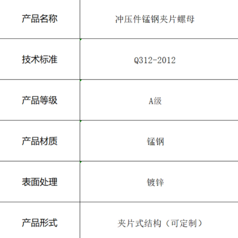 本产品为符合Q 312-2012标准的冲压件锰钢夹片螺母,采用高强度锰钢制造并经镀锌处理。独特的夹片式设计通过弹性夹持力牢固固定在板材边缘,无需焊接或铆接,为钣金件提供快速可靠的螺纹连接解决方案。