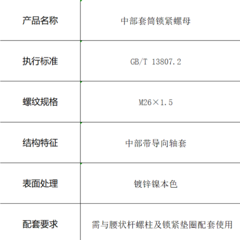 本品为符合GB/T 13807.2标准的中部套筒锁紧螺母,规格M26×1.5细牙螺纹。采用中部导向轴套结构,表面经过镀锌镍处理,具有优良的防腐蚀性能。作为腰状杆螺柱连接系统的核心组件,专为重载、抗振的精密连接场合设计。