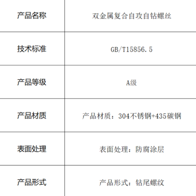 本产品为符合GB/T15856.5标准的自攻自钻螺丝,采用304不锈钢与435碳钢双金属复合材料制造。创新的钻尾设计和双金属结构兼具高硬度和强韧性,可在厚铁板等硬质基材上实现自钻孔、攻丝、锁紧一次完成,防腐涂层提供额外保护。