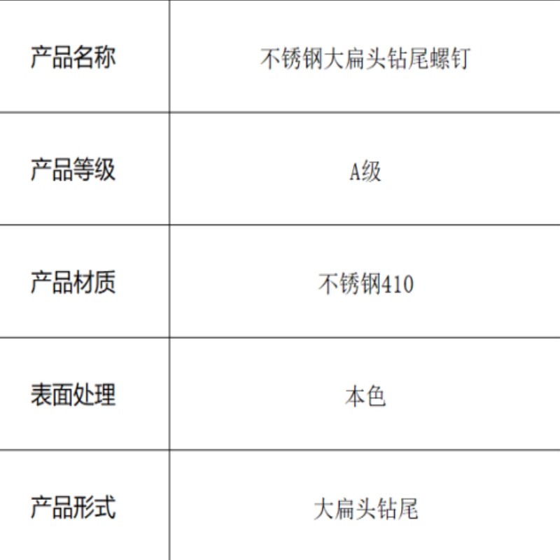 本产品为不锈钢大扁头钻尾螺钉,采用410不锈钢材料制造。大扁头设计提供更大的承载面积,钻尾尖端可自钻孔攻丝,410不锈钢材质具备良好的强度和耐腐蚀性,为金属薄板、钢结构等需要快速安装的场合提供高效便捷的紧固解决方案。