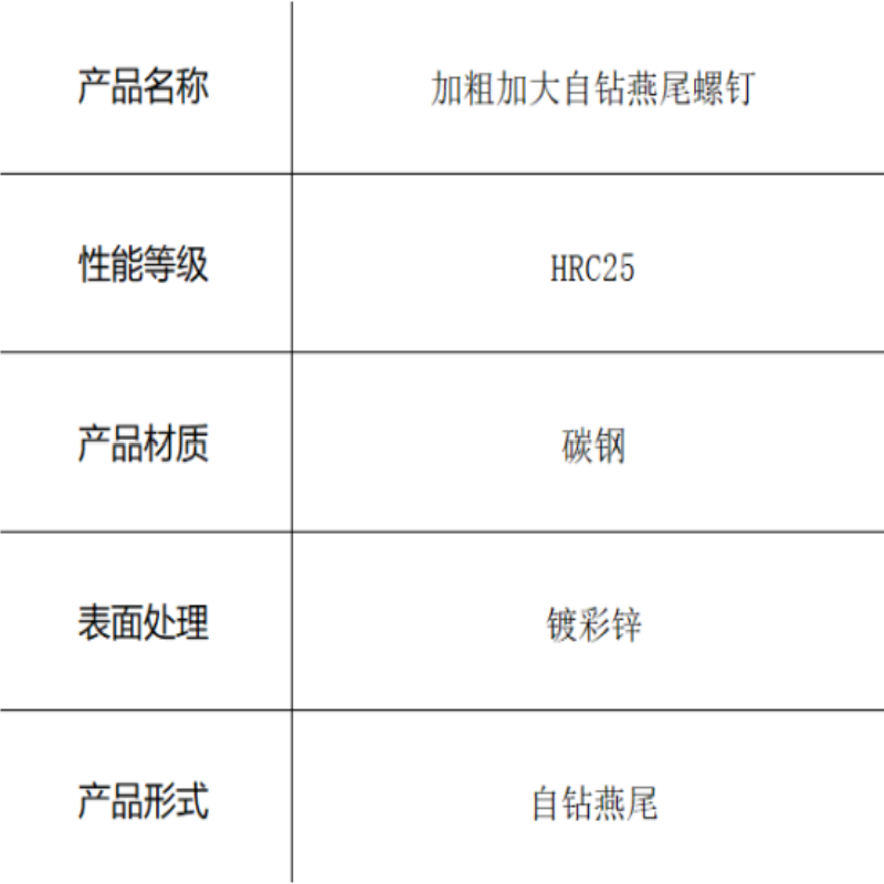 本产品为加粗加大自钻燕尾螺钉,采用碳钢材料制造。独特的燕尾槽设计增强抗振动性能,加粗加大结构提供更高承载能力,HRC25硬度平衡强度与韧性,镀彩锌表面处理提升耐腐蚀性,为重型设备、结构工程等需要高可靠性紧固的场合提供强力保障。