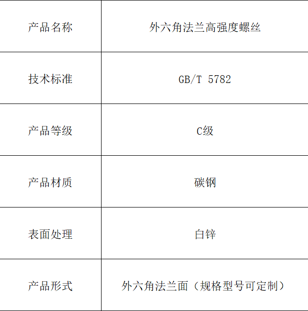 本产品为符合GB/T 5782标准的外六角法兰面螺栓,性能等级为高强度8.8级。其头部集成的法兰面可替代垫圈,增大接触面积,提供优异的防松性能。表面白锌处理赋予其良好的防锈能力,适用于需要高强度连接与可靠防松的各类机械与结构。