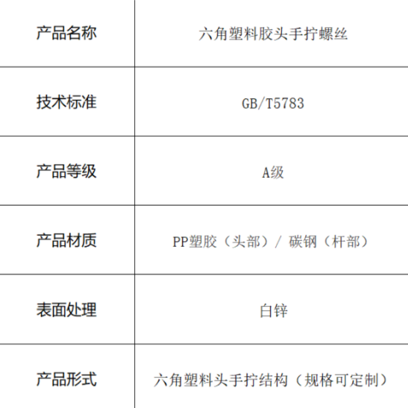 本产品为符合GB/T5783标准的六角塑料胶头手拧螺丝,采用PP塑胶头部与碳钢杆部组合制造。性能等级4.8级,杆部白锌处理提供基础防锈。塑料头部支持直接手拧操作,兼具绝缘与舒适握感,适用于需要频繁调节且要求绝缘的场合。