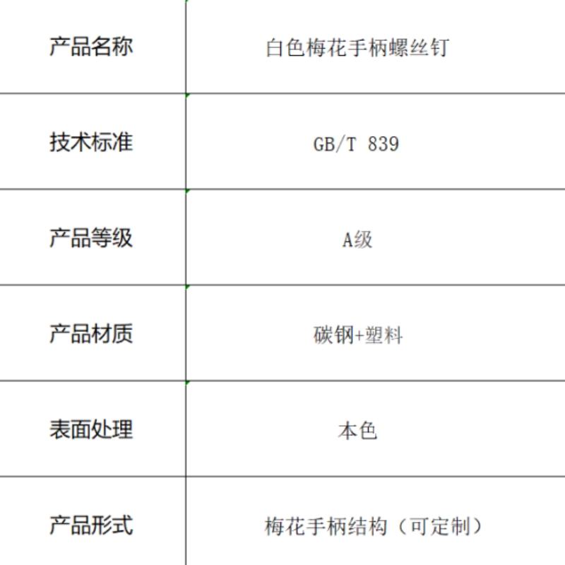 本产品为符合GB/T 839标准的白色梅花手柄螺丝钉,采用碳钢与塑料复合材质制造。独特的梅花手柄设计提供了便捷的手动操作体验,无需额外工具即可快速拧紧或拆卸,适用于需要频繁调节或维护的场合。