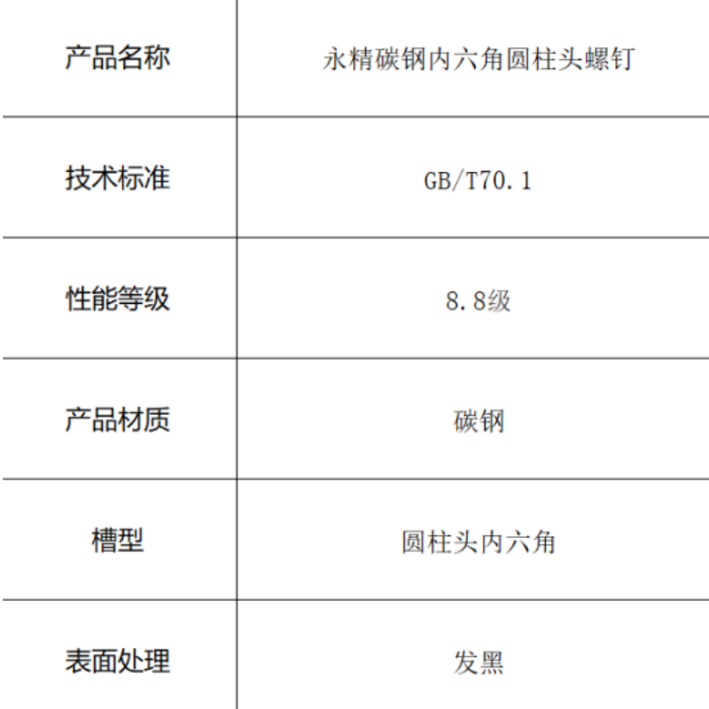 本产品为符合GB/T70.1标准的内六角圆柱头螺钉,性能等级达到8.8级,采用碳钢材料制造,表面进行发黑处理。该螺钉具有可靠的机械性能和良好的防锈能力,内六角驱动设计允许便捷安装并节省操作空间,是工业应用中经济实用的紧固解决方案。
