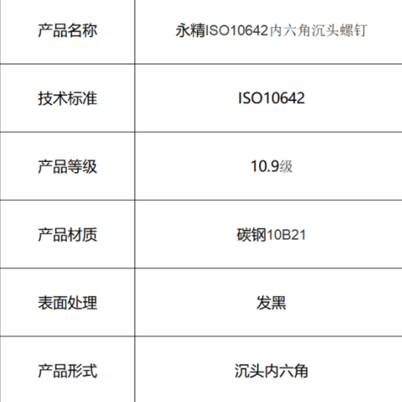 本产品为符合ISO10642标准的内六角沉头螺钉,性能等级达到10.9级,采用碳钢10B21材料制造,表面进行发黑处理。该螺钉采用沉头设计,安装后头部可完全沉入工件表面以下,形成平整的连接界面,同时具备高强度和良好的防锈能力,是工业应用中经济实用的高强度紧固解决方案。