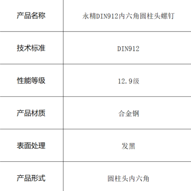 本产品为符合DIN912标准的内六角圆柱头螺钉,性能等级达到12.9级,采用高强度合金钢材料制造,表面进行发黑处理。该螺钉具有极高的抗拉强度和抗疲劳性能,内六角驱动设计允许施加更大的拧紧扭矩,同时节省安装空间,适用于要求高强度的关键连接部位。