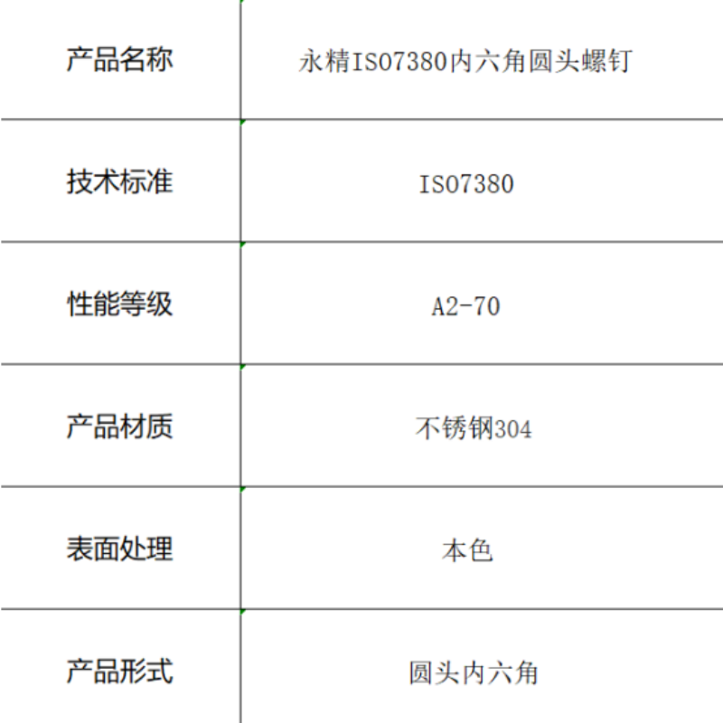 本产品为符合ISO7380标准的内六角圆头螺钉,材质为不锈钢304,性能等级达到A2-70级,表面为本色处理。该螺钉采用圆头设计,兼具美观外形和便捷安装特性,内六角驱动方式提供可靠的扭矩传递,同时不锈钢材质确保良好的耐腐蚀性能。