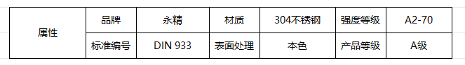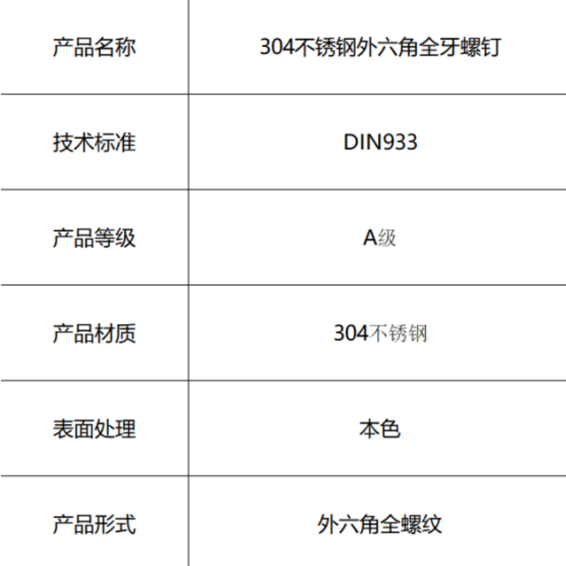 本产品为符合DIN933标准的外六角全牙螺钉,采用304不锈钢材质制造,性能等级达到A2-70级,表面保持不锈钢本色。该螺钉采用全螺纹设计,配合标准外六角头部,便于使用通用工具进行安装,兼具良好的耐腐蚀性能和安装便利性,适用于对防锈性能和安装灵活性有要求的各类工业场合。