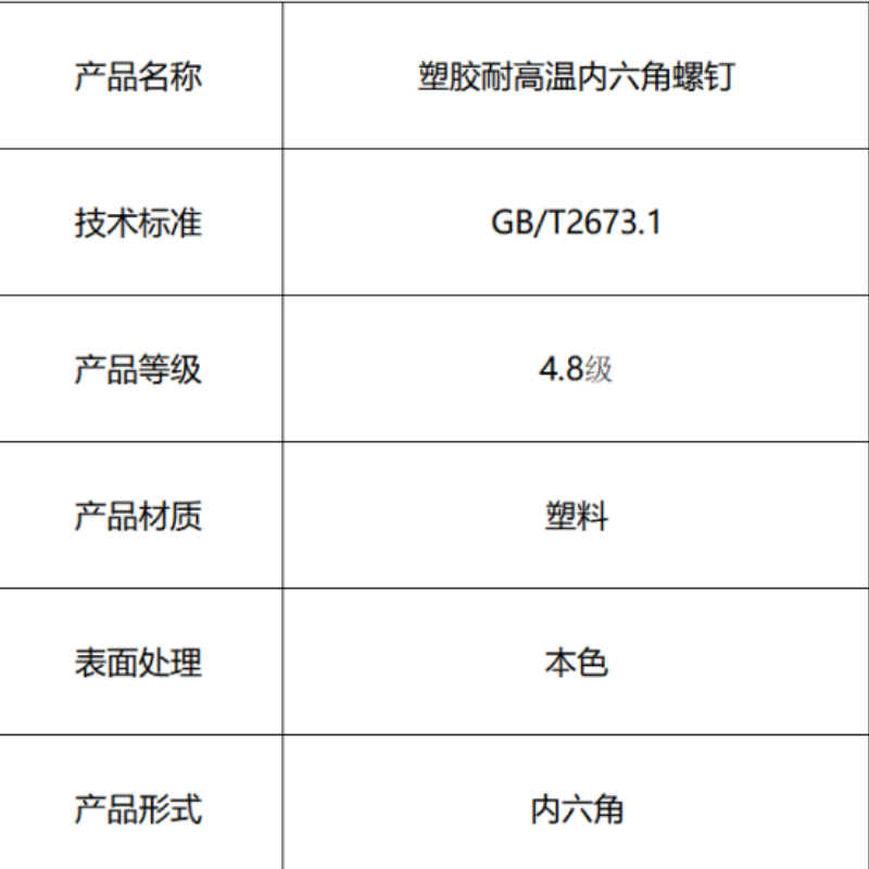 本产品为符合GB/T2673.1标准的塑胶耐高温内六角螺钉,采用特种工程塑料制造。具有优异的耐高温性能和绝缘特性,4.8级性能等级确保基本的机械强度,内六角驱动设计便于安装拆卸,为电子设备、电器产品等需要绝缘和耐高温的应用提供安全可靠的紧固解决方案。