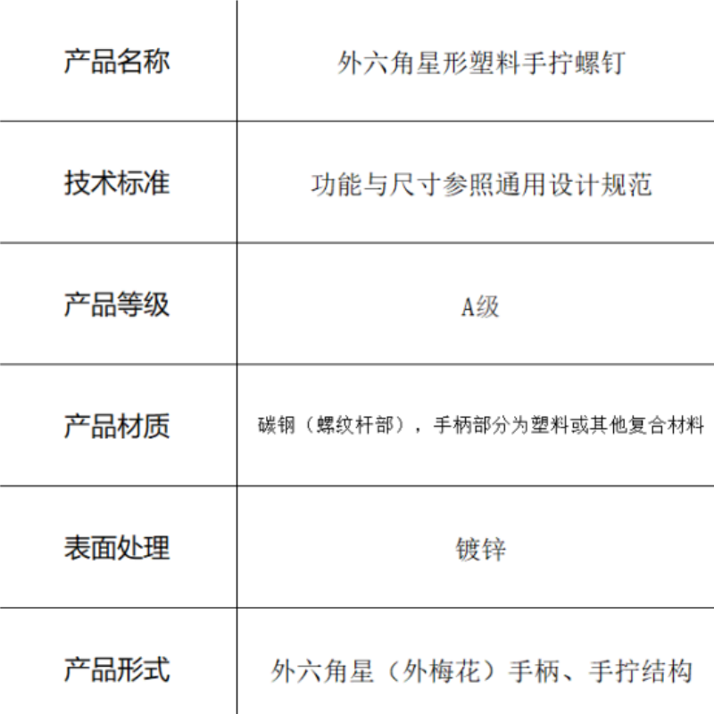 本产品为外六角星形手拧螺钉,螺纹杆部采用碳钢制造,性能等级为4.8级,确保足够的连接强度。其核心特征在于头部设计为外六角星形塑料手柄,这种创新的外梅花结构完美融合了工具的效能与手动操作的便捷:既可以直接用手快速拧动,实现无工具操作;也能在需要更高扭矩时,使用专用的套筒或扳手进行紧固。螺纹杆部表面镀锌,提供了可靠的电化学防锈保护,延长了产品在常规环境下的使用寿命。