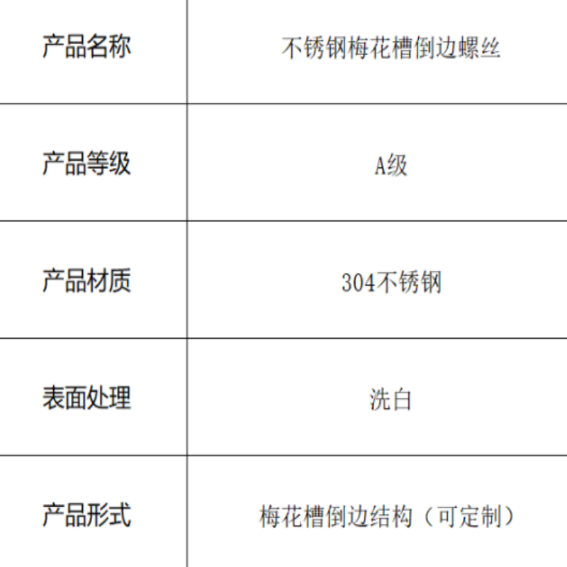 本产品为不锈钢梅花槽倒边螺丝,采用304不锈钢材料制造。独特的梅花槽与倒边设计提供了良好的驱动扭矩和便于对齐的导入角度,通过螺纹连接为部件提供可靠的紧固作用。