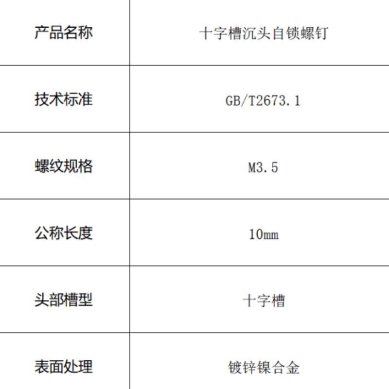 本品为符合GB/T2673.1国标的十字槽沉头自锁螺钉,规格M3.5×10mm。它集沉头结构的平整性与尼龙圈的自锁功能于一体,表面采用镀锌镍合金处理,兼具优良的防锈能力与美观性。专为解决电子电器、精密设备在振动环境下的螺纹松动问题而设计,是一款可靠、高效的防松紧固件。