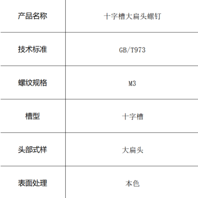 本品为符合GB/T973标准的十字槽大扁头螺钉,规格M3×5mm。采用大直径扁头设计,提供较大的承载面积,能有效分散紧固压力。十字槽型便于使用标准螺丝刀进行操作,表面保持金属本色,适用于对表面接触面积有特殊要求的连接场景。