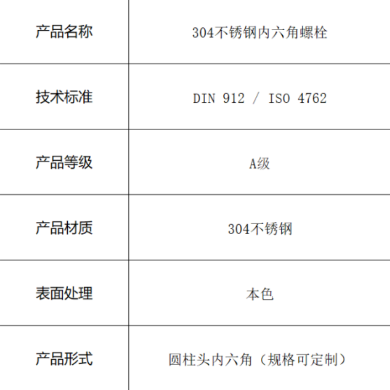本产品为符合德标DIN 912标准的304不锈钢内六角螺栓,采用A2-70性能等级的304不锈钢制造。产品保持不锈钢原色,提供优良的耐腐蚀性,圆柱头设计兼顾美观与紧凑的安装空间,是精密设备与高端装备的理想连接件。