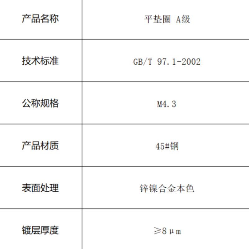 本品为符合GB/T 97.1-2002标准的A级平垫圈,公称规格M4.3。采用45#钢制造,表面采用高性能锌镍合金镀层,厚度达8μm以上。产品具有精确的尺寸精度和卓越的耐腐蚀性能,专为汽车等对可靠性要求高的领域设计。