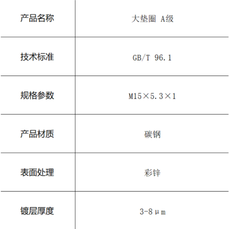 本品为符合GB/T96.1标准的A级大垫圈,规格M15×5.3×1。采用碳钢材质制造,表面彩锌镀层处理。产品具有较大的支承面积和精确的尺寸控制,专为需要分散压力、保护连接表面的应用场景设计。