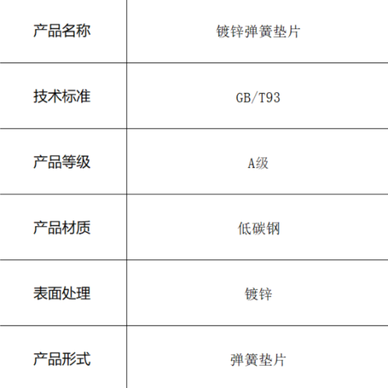 本产品为符合GB/T93标准的镀锌弹簧垫片,采用低碳钢材料制造。开口弹簧设计在受压时产生持续的弹性反力,4.8级性能等级确保基本的机械性能,镀锌表面处理提高耐腐蚀性,能有效防止螺栓螺母在振动环境下松动,为通用机械设备提供经济可靠的防松解决方案。