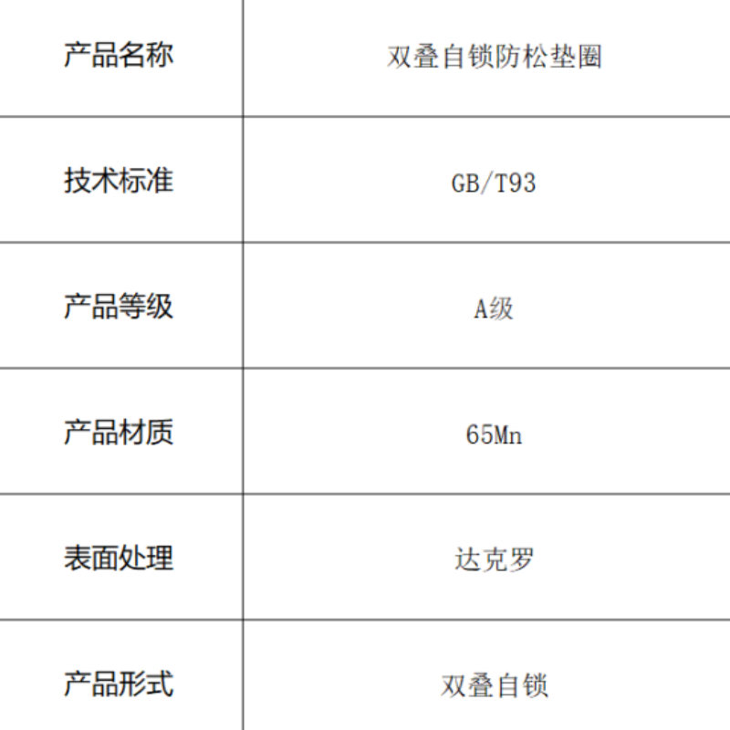 本产品为符合GB/T93标准的双叠自锁防松垫圈,采用65Mn弹簧钢制造。经过热处理达到42-50HRC硬度,具备优异的弹性与抗疲劳性能,结合达克罗表面处理提供卓越的耐腐蚀防护,双叠自锁设计能有效防止螺栓螺母在振动环境下松动,为关键连接部位提供持久可靠的防松保障。