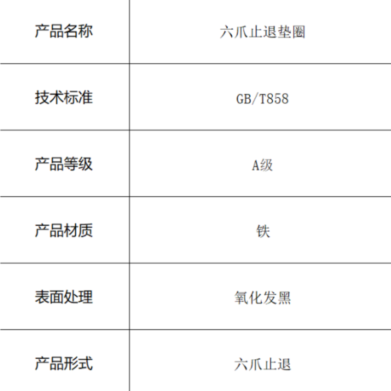 本产品为符合GB/T858标准的六爪止退垫圈,采用铁材料制造。独特的六爪设计能与螺栓头部或螺母形成有效啮合,通过氧化发黑表面处理提高耐腐蚀性,100HV性能等级确保基本机械性能,有效防止紧固件在振动工况下回转松动,为机械设备提供经济可靠的防松解决方案。