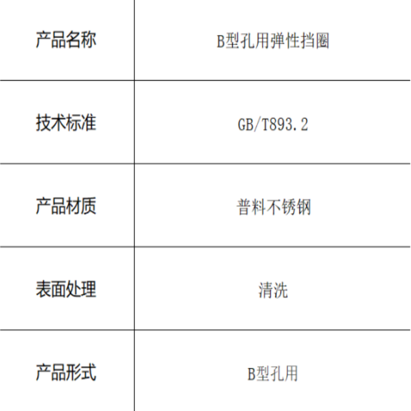 本产品为符合GB/T893.2标准的B型孔用弹性挡圈,采用普料不锈钢制造。具有良好的耐腐蚀性能和弹性恢复能力,通过清洗处理确保产品洁净,为孔用安装提供可靠的轴向固定和限位功能。