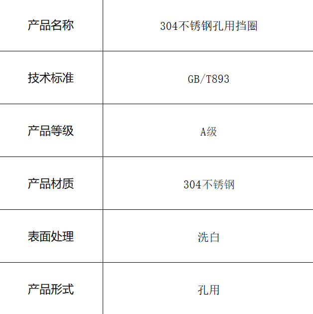 本产品为符合GB/T893标准的304不锈钢孔用挡圈,采用304不锈钢材料制造。具有良好的耐腐蚀性能和可靠的弹性,通过洗白表面处理保持不锈钢本色洁净外观,为孔用安装提供稳定持久的轴向固定和限位功能。