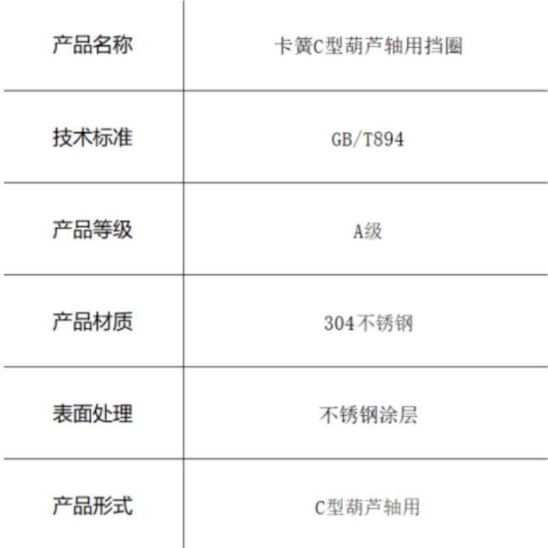 本产品为符合GB/T894标准的卡簧C型葫芦轴用挡圈,采用304不锈钢材料制造。独特的葫芦型轮廓设计增大了接触面积并便于安装,通过不锈钢涂层表面处理进一步增强耐腐蚀性,为轴用安装提供牢固可靠的轴向固定和限位功能。