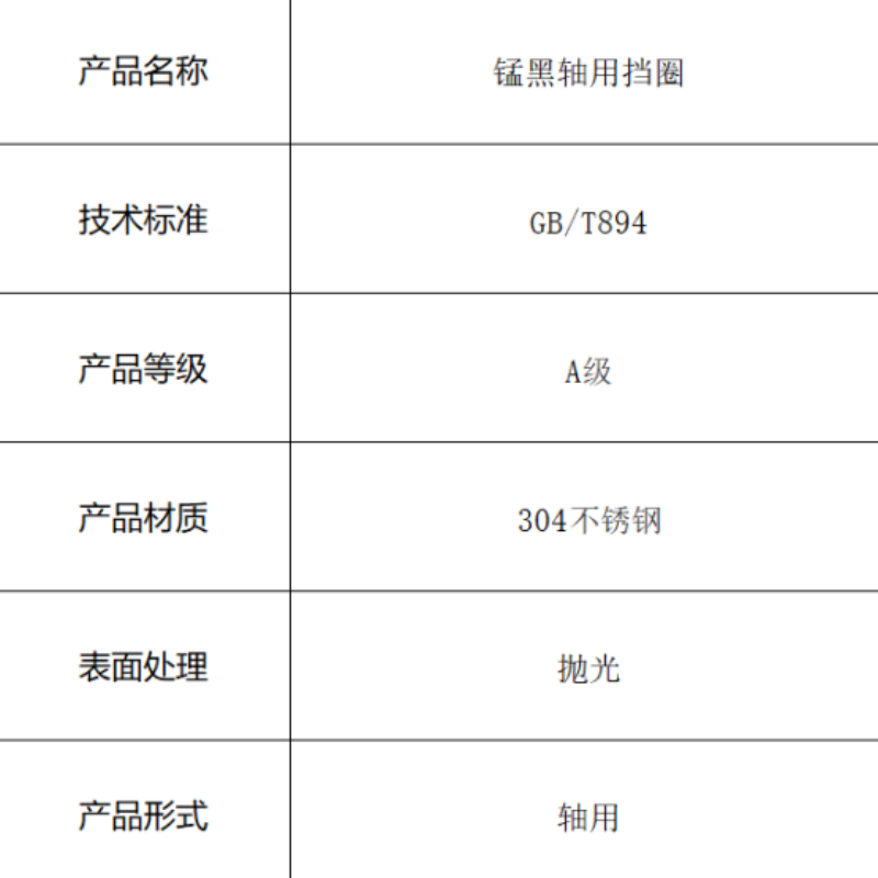 本产品为符合GB/T894标准的锰黑轴用挡圈,采用304不锈钢材料制造。经过精密抛光的表面处理,具有良好的光洁度和耐腐蚀性能,为轴用安装提供可靠的轴向固定和限位功能。