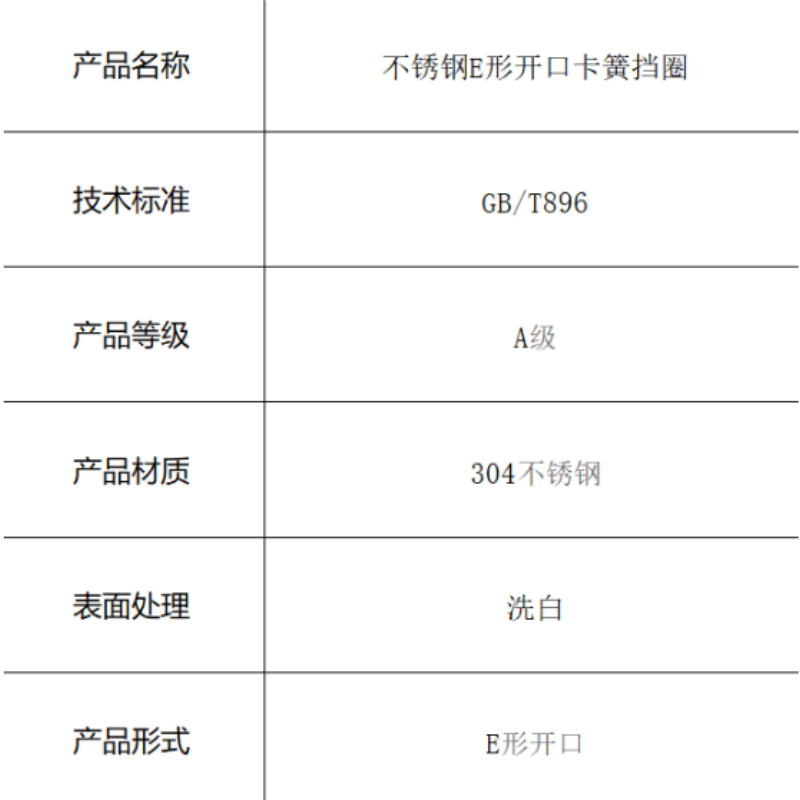 本产品为符合GB/T896标准的不锈钢E形开口卡簧挡圈,采用304不锈钢材料制造。优异的耐腐蚀性能,通过洗白表面处理保持不锈钢本色,为轴用安装提供便捷可靠的轴向固定和限位功能。