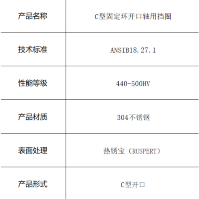 本产品为符合ANSIB18.27.1标准的C型固定环开口轴用挡圈,采用304不锈钢材料制造。通过热处理达到440-500HV的硬度,具备优异的耐磨性与强度,结合热锈宝(RUSPERT)表面处理提供卓越的耐腐蚀防护,为轴用安装提供持久可靠的轴向固定方案。