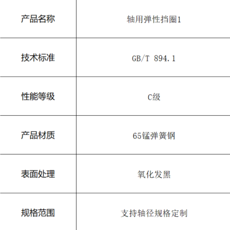 本品为符合国标GB/T 894.1的轴用弹性挡圈,采用65锰弹簧钢制造,经热处理和氧化发黑表面处理。其高弹性和耐磨性可牢固卡入轴槽,为轴承、齿轮等零部件提供可靠的轴向定位,适用于高负荷和振动环境。