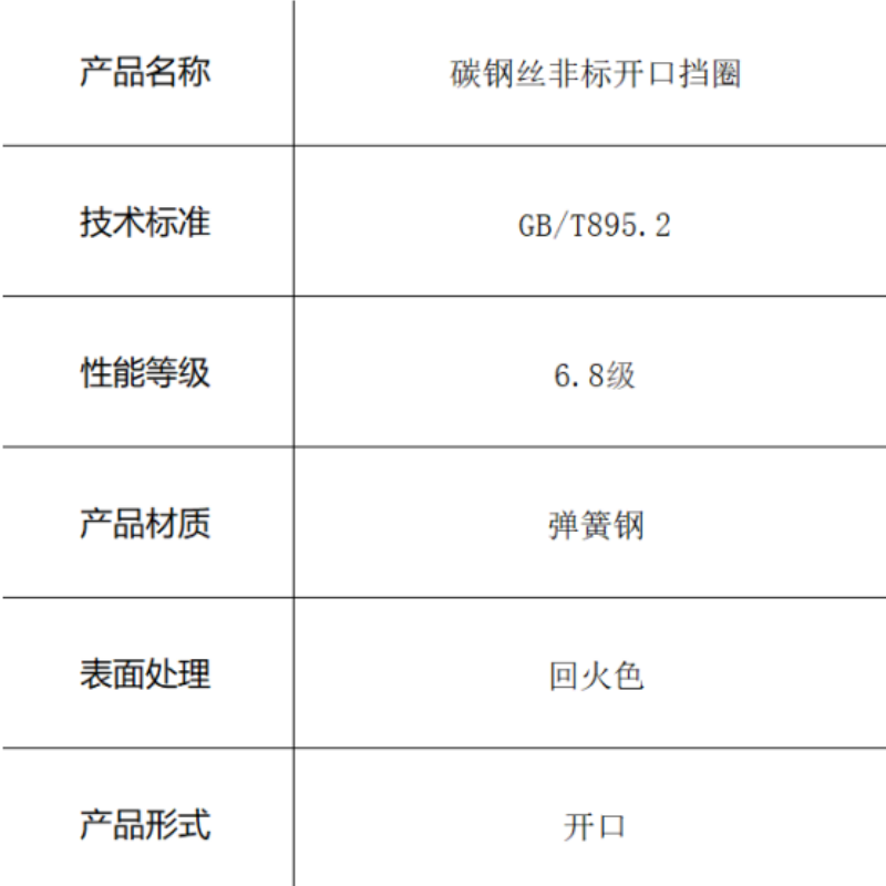 本产品为符合GB/T895.2标准的碳钢丝非标开口挡圈,采用优质弹簧钢制造。经过热处理达到6.8级性能等级,具备良好的弹性与强度,回火色表面不仅提供基础防护,更便于生产过程中的质量监控,为轴用安装提供经济可靠的轴向固定方案。