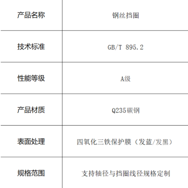 本品为符合国标GB/T 895.2的A级钢丝挡圈,采用Q235碳钢制造,表面形成致密的四氧化三铁保护膜(发蓝处理),有效防锈。该产品由圆形钢丝精确成型,通过其自身的弹性卡入轴用沟槽,为轴承等零部件提供经济的轴向定位。