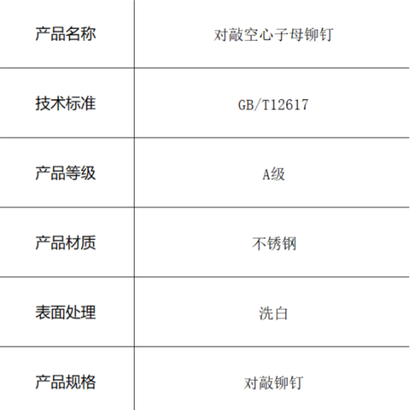 本产品为符合GB/T12617标准的对敲空心子母铆钉,采用优质不锈钢材料制造。创新的子母对敲结构通过两侧同时敲击形成牢固铆接,空心设计减轻重量且便于线束穿过,洗白处理提供洁净表面与基础防锈,适用于需要双侧施工且要求结构强度的连接场景。