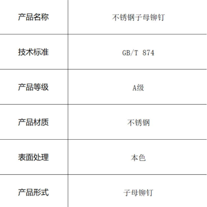 本产品为符合GB/T 874标准的不锈钢子母铆钉,采用优质不锈钢材料制造。精密加工的母钉与公钉通过过盈配合形成牢固连接,安装后铆接面平整光滑,不锈钢材质提供优异的耐腐蚀性,特别适用于对表面平整度和防锈要求高的薄板材料对接装配。
