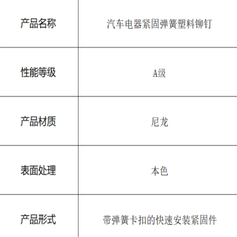 产品名称:汽车电器紧固弹簧塑料铆钉