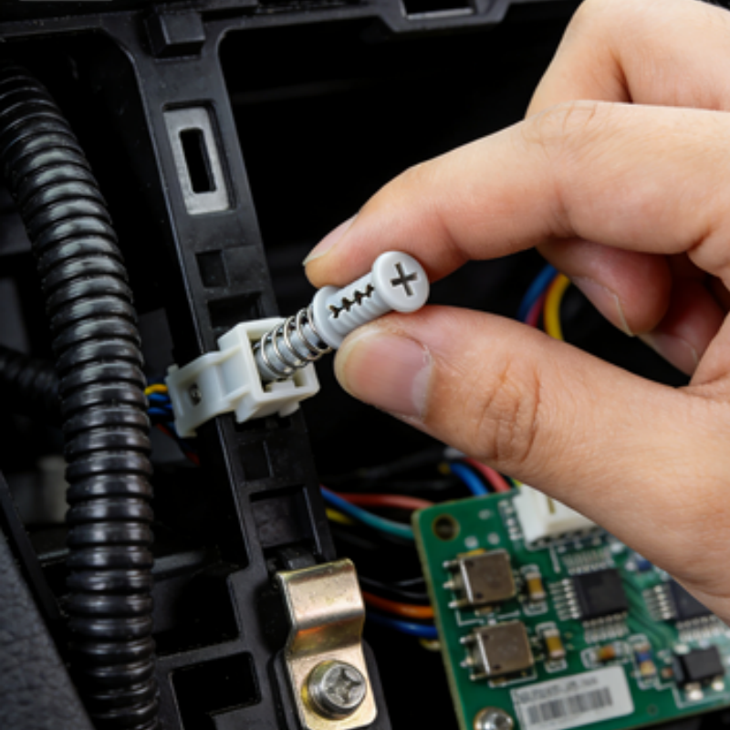本品为专为汽车电器设计的弹簧塑料铆钉,采用优质尼龙材料制成。独特的弹簧卡扣结构使其具备优异的弹性保持力,安装后能有效抵抗振动,确保线束、管路等在车辆运行中的持久固定。