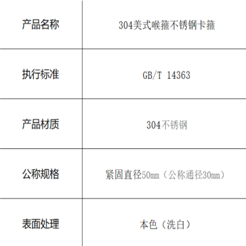 本品为符合GB/T 14363技术要求的304不锈钢美式喉箍,采用蜗轮蜗杆锁紧结构。其紧固直径为50mm,适用于公称通径约30mm的软管连接。该产品凭借不锈钢材质与均匀的锁紧力,为软管与管件的连接提供可靠、耐用的紧固方案。