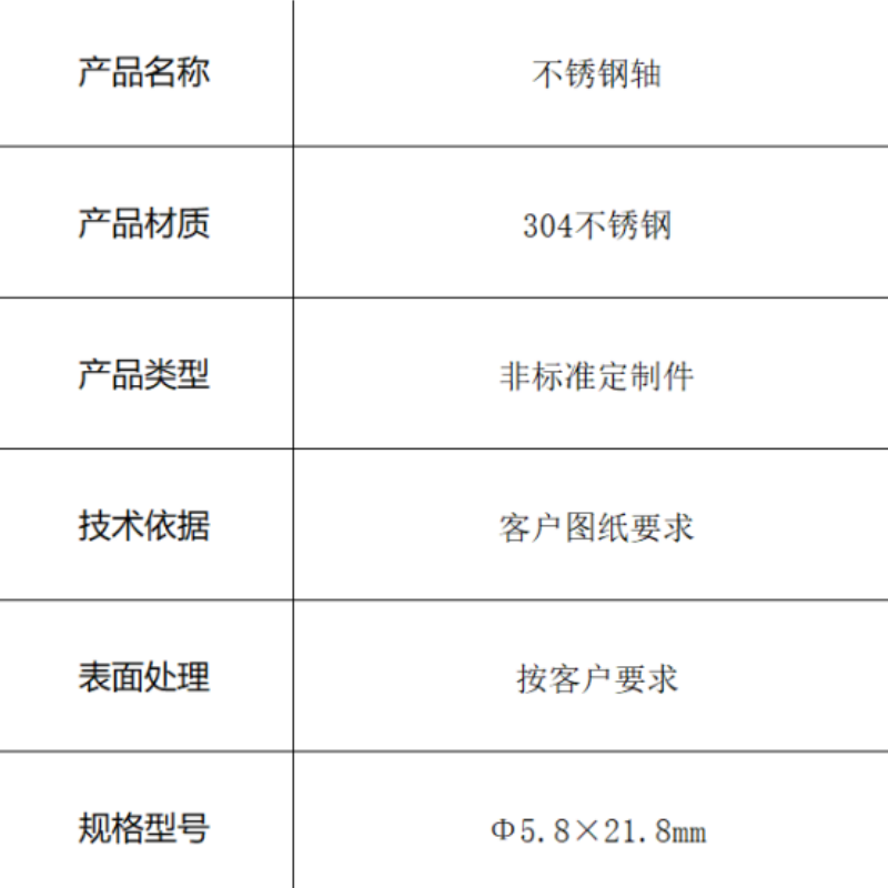 本品为按图定制的非标准不锈钢光轴,规格Φ5.8×21.8mm,采用304不锈钢材质制造。产品完全按照客户提供的技术图纸加工,确保尺寸精度和材料性能符合特定使用需求,满足个性化应用场景。