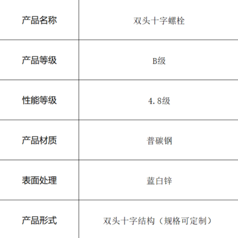 本产品为双头十字结构螺栓,采用普碳钢制造,性能等级4.8级。表面蓝白锌处理提供良好防锈效果与美观外观,独特的双头十字设计支持双向安装,适用于需要工具快速拆装且对强度要求不高的连接场景。