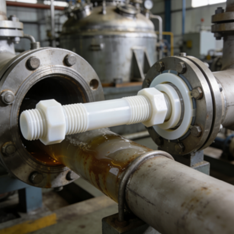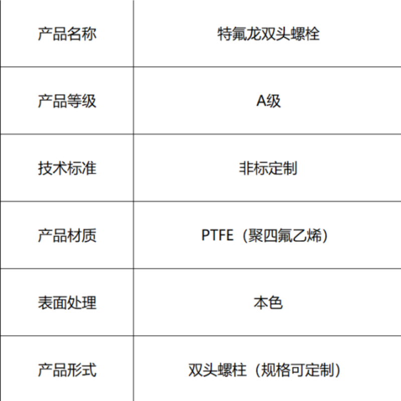 本产品为特氟龙(PTFE)材质的双头螺栓,采用100%聚四氟乙烯原料制造。具有纯白色的本色外观,具备卓越的耐腐蚀性、低摩擦系数和高绝缘特性,专为强腐蚀、高洁净及绝缘环境下的特殊紧固需求设计。