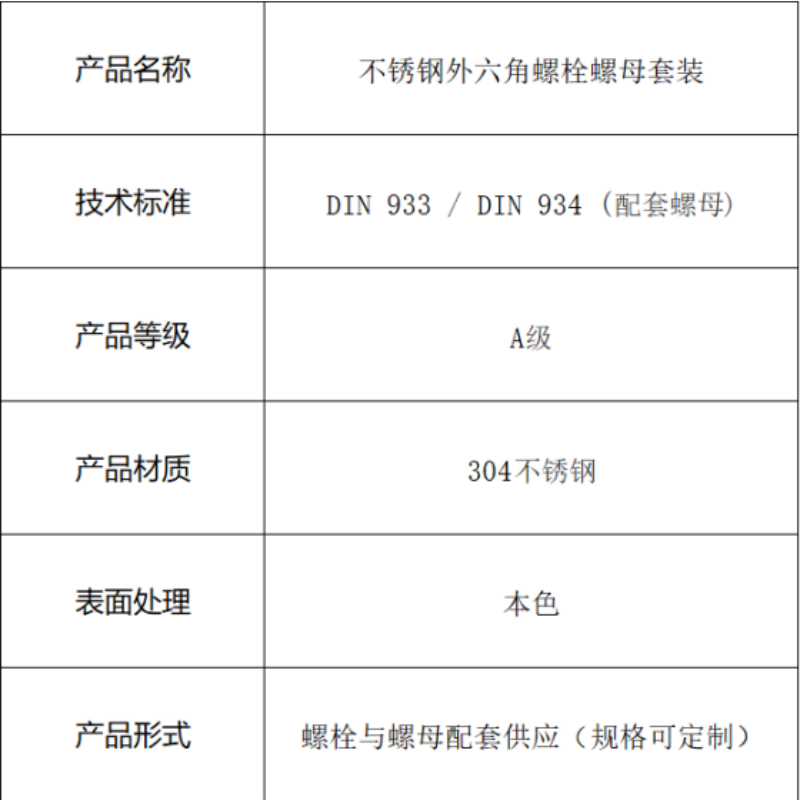 本产品为符合德标DIN标准的304不锈钢外六角螺栓与螺母套装。A2-70性能等级提供可靠的机械性能,本色表面保持了不锈钢的原貌,具备优异的耐腐蚀性和清洁度,是要求防锈和卫生环境的理想紧固件组合。