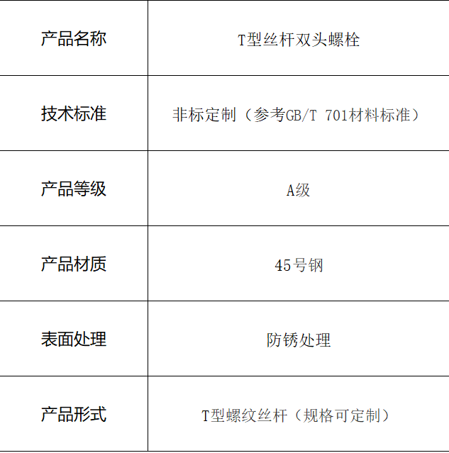 本产品为T型丝杆结构的双头螺栓,采用GB/T 701标准的45号优质碳素结构钢制造。独特的T型螺纹设计专为传递强大轴向力而优化,经过防锈处理,适用于需要重载升降、精准定位及线性传动的机械装置。