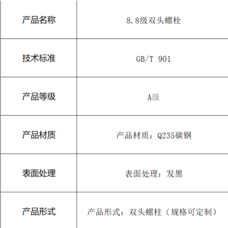 本产品为符合GB/T 901标准的8.8级高强度双头螺栓,采用Q235碳钢制造并经发黑处理。全螺纹设计使螺母可在杆身任意位置锁紧,发黑层提供均匀的防锈外观和基础防腐蚀能力,适用于需要高强度贯穿连接且对防锈有一般要求的场合。