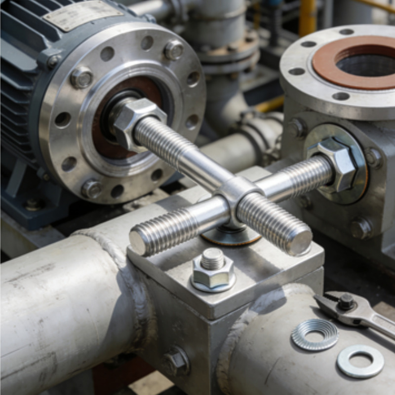 本产品为符合GB/T 901标准的双头螺栓套装,采用304不锈钢材质并经过洗白处理。螺栓两端均加工螺纹,中间为光杆,专用于连接两个带通孔的零件,为法兰、衬套及设备结构提供可靠的螺纹连接方案。