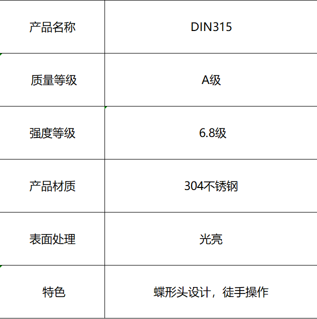 本产品为高品质蝶形螺栓螺母套装,严格遵循DIN315标准制造。螺栓性能等级达到6.8级,材质为耐用的304不锈钢,表面呈光亮处理。其独特的蝶翼形头部设计,无需任何工具即可实现徒手快速拧紧与拆卸,特别适用于需要频繁调节或工具不便使用的场合。