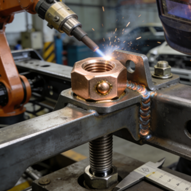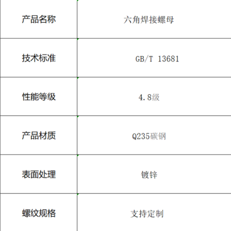 本产品为符合GB/T 13681标准的A级六角焊接螺母,采用Q235碳钢制造,性能等级4.8级,表面镀锌处理。产品专为焊接工艺设计,可在金属板材上实现牢固的内螺纹连接,为钣金结构提供可靠的螺纹基础。