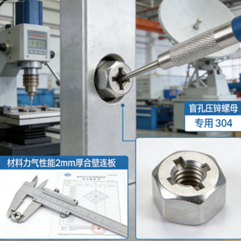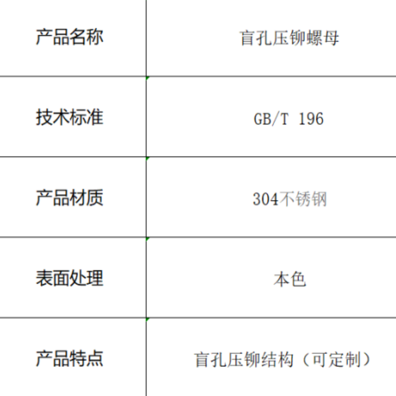 本产品为符合GB/T 196标准的盲孔压铆螺母,采用304不锈钢材质。盲孔设计有效防止液体和灰尘通过螺纹孔进入设备内部,通过压铆工艺可在薄板上形成牢固的内螺纹连接点,兼具密封性与结构性需求。