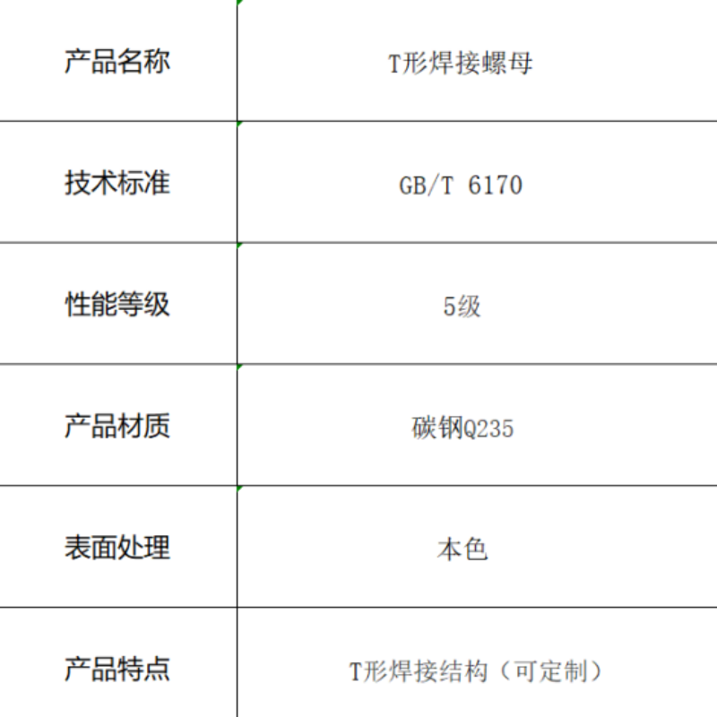 本产品为符合GB/T 6170标准的T形焊接螺母,采用Q235碳钢材料制造。独特的T形底部设计增大了焊接接触面积,通过焊接方式与基材形成永久性连接,为金属结构件提供牢固可靠的内螺纹固定点。